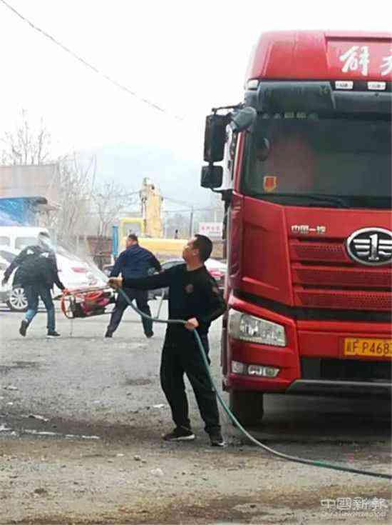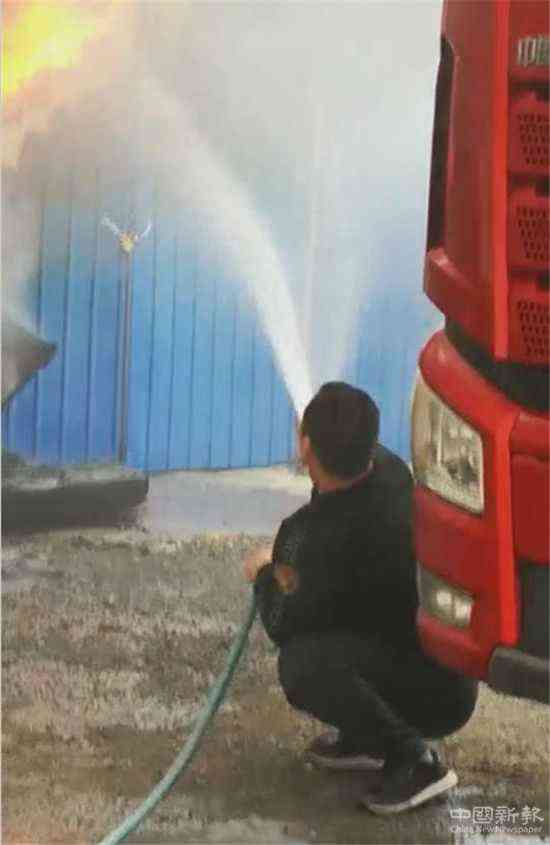一位在現(xiàn)場(chǎng)的村民指著韓園樂說,如果沒有他們幫助救火和撥打消防隊(duì)電話,這大火隨時(shí)都可能引起旁邊貨車油箱及廠內(nèi)存放的電瓶、柴油的爆炸,后果不堪設(shè)想。