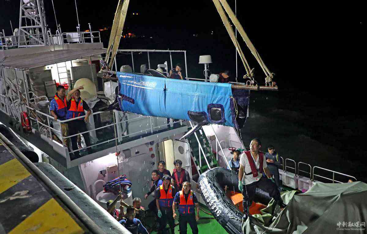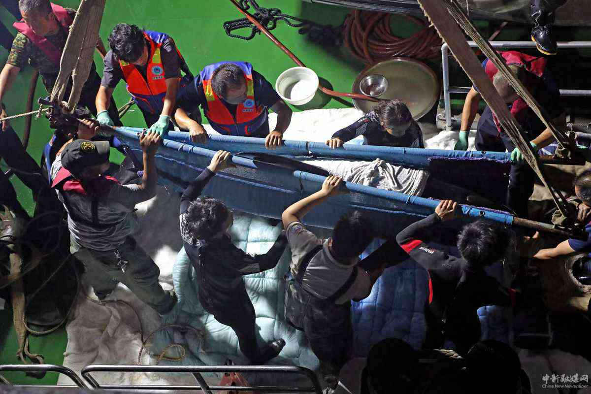 7月7日晚,救援人員對(duì)瓜頭鯨執(zhí)行放歸大海行動(dòng)。(潘侃俊 攝)