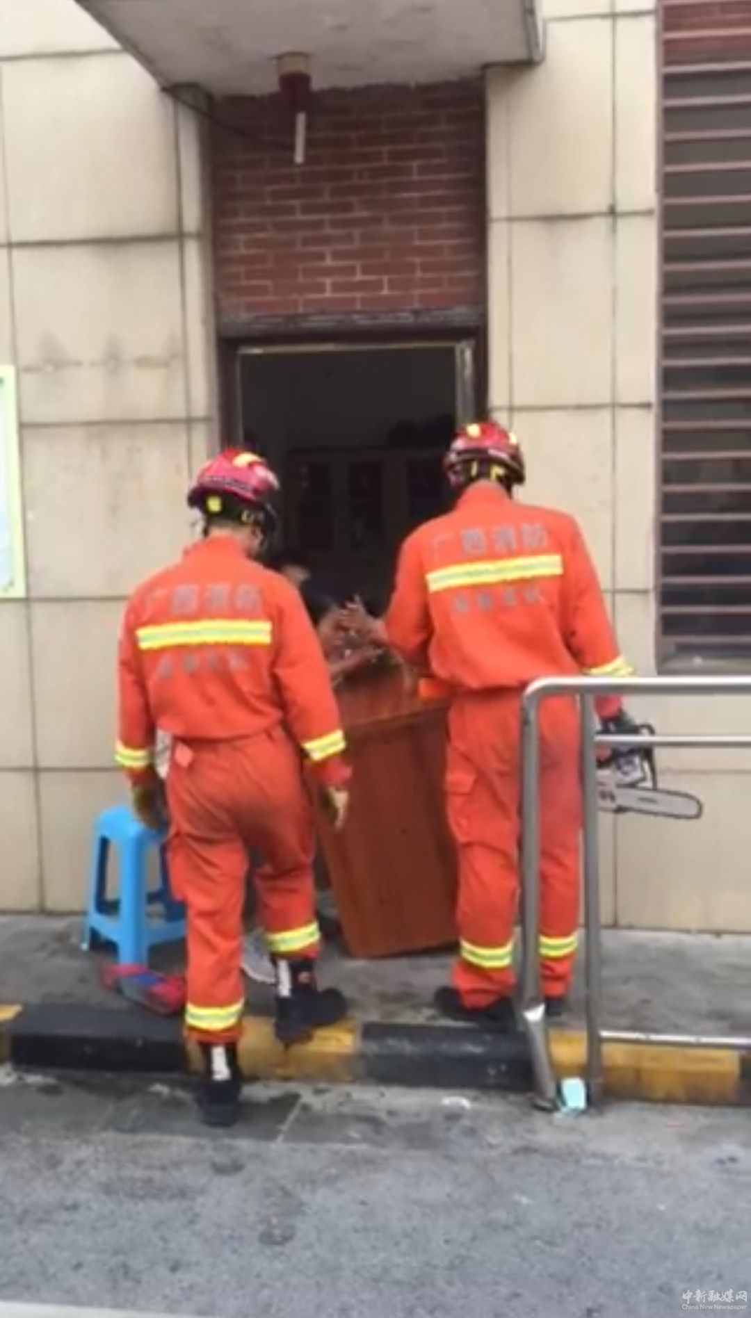 711日,聯(lián)泰物業(yè)工作人員將一名中年女性業(yè)主夾在門檻和辦公桌之間,消防救援人員正在施救。視頻截圖