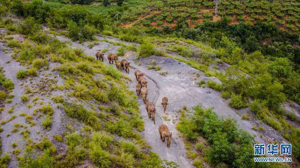 這是5月28日在云南省玉溪市峨山縣境內(nèi)拍攝的象群(無人機(jī)照片)。新華社記者 胡超 攝