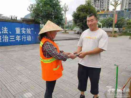 8月29日上午11時(shí)許,負(fù)責(zé)清掃桐梓縣高鐵東站道路的環(huán)衛(wèi)工人曾祥素像往常一樣進(jìn)行日常保潔工作,在清掃君悅國(guó)際附近路段時(shí),在馬路中間撿到一個(gè)錢包,錢包里有1240元現(xiàn)金、一張銀行卡和一張身份證。撿到大額的現(xiàn)金,曾祥素并沒有為之所動(dòng),她第一時(shí)間想到的就是“失主肯定非常著急!”于是,她站在原地等候了一會(huì),見無(wú)人前來(lái)認(rèn)領(lǐng),便打電話給該片區(qū)的環(huán)衛(wèi)管理人員,請(qǐng)管理人員想辦法聯(lián)系失主。經(jīng)過多方聯(lián)系,在當(dāng)天下午14時(shí)許終于找到了失主,并把錢包親自交到了失主手里。
