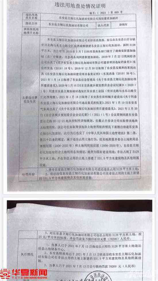 上述《違法用地查處情況證明》稱,“當事人已于2021年7月13日將違法占用的3128平方米土地退還給縣土地儲備中心;東安縣財政局已于2021年7月13日依法沒收東安縣立翔石化加油站有限公司在非法占用的土地上新建的531.5平方米建筑物及其他附屬設施;當事人已于2021年7月13日自行繳納罰款78200元。據(jù)知情人透露,該油站在被處罰后仍然是處于施工狀態(tài),該加油站早在幾個月前就已違法搶占該尚未成交地塊,在被查出后近一個月時間中還是有人在施工,后因被投訴才不得不停止施工。