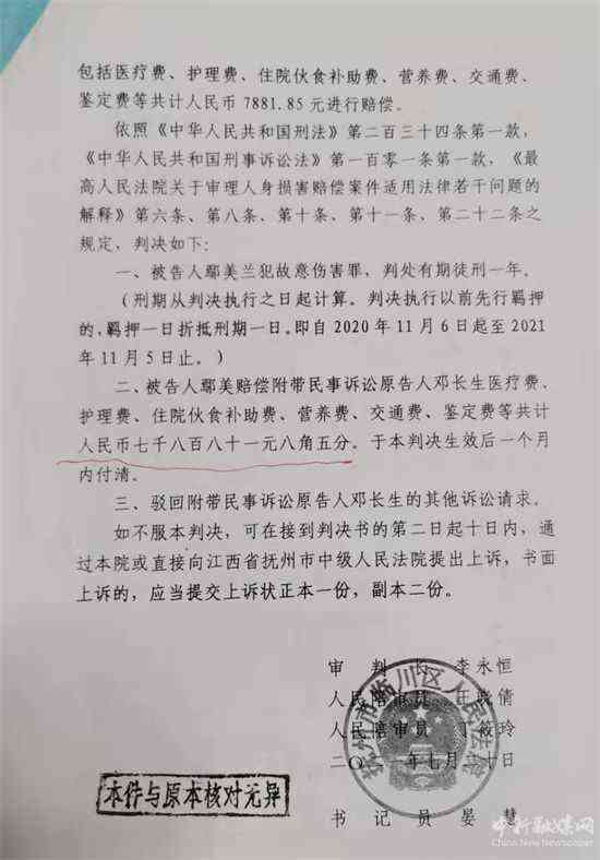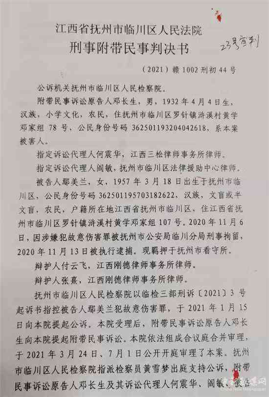 2021年7月20日,江西省撫州市臨川區(qū)人民法院下達(dá)了一份《刑事附帶民事判決書》(2021贛1002刑初44號),判決被告人鄢美蘭犯故意傷害罪,判處有期徒刑一年,并賠償原告鄧長生醫(yī)療等費(fèi)用7881.85元。