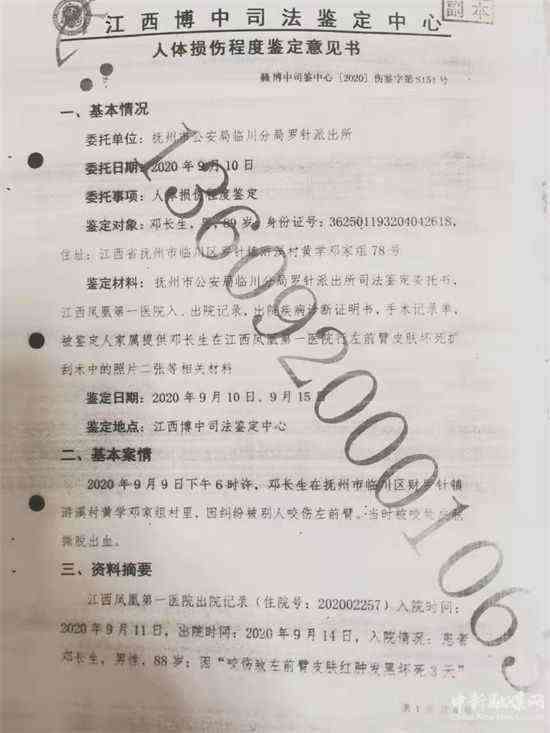2020年9月16日,江西博中司法鑒定中心經(jīng)傷情檢驗(yàn),結(jié)合醫(yī)院病歷資料,認(rèn)為鄧長生左前臂等處軟組織挫裂傷,其形態(tài)特征附合鈍性外力(如人牙咬合等)作用形成,構(gòu)成輕傷二級。