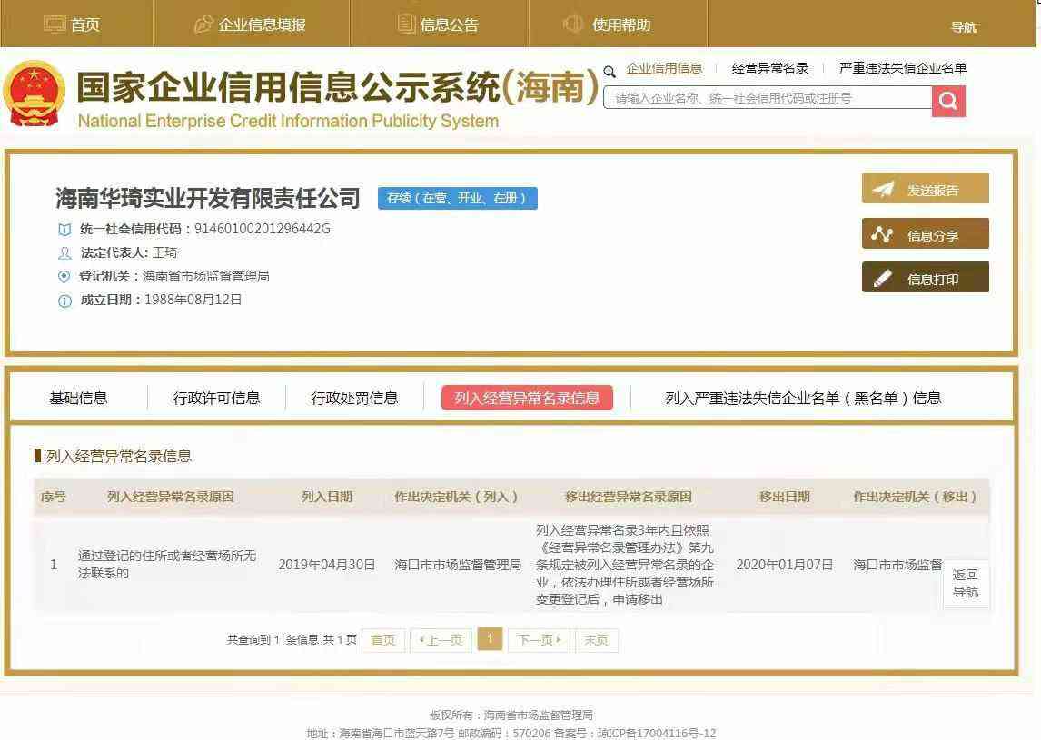 在晟盛公司看來,華琦公司其實就是一個皮包公司,主要靠炒地皮發(fā)家。公開信息可見,晟盛公司這樣的說法并非捕風(fēng)捉影,2019年4月30日,華琦公司因通過登記的住所或者經(jīng)營場所無法聯(lián)系,曾被??谑惺袌霰O(jiān)督管理局列入經(jīng)營異常名錄,一直到2020年1月7日才被??谑惺袌霰O(jiān)督管理局從經(jīng)營異常名錄中移出。