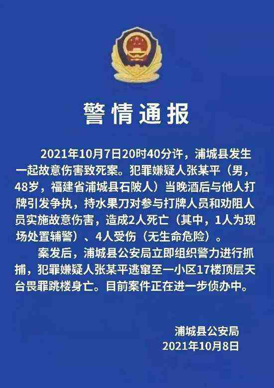 10月8日,浦城縣公安局發(fā)布警情通報:2021年10月7日20時40分許,浦城縣發(fā)生一起故意傷害致死案。犯罪嫌疑人張某平(男,48歲,福建省浦城縣石陂人)當晚酒后與他人打牌引發(fā)爭執(zhí),持水果刀對參與打牌人員和勸阻人員實施故意傷害,造成2人死亡(其中1人為現場處置輔警)、4人受傷(無生命危險)。
