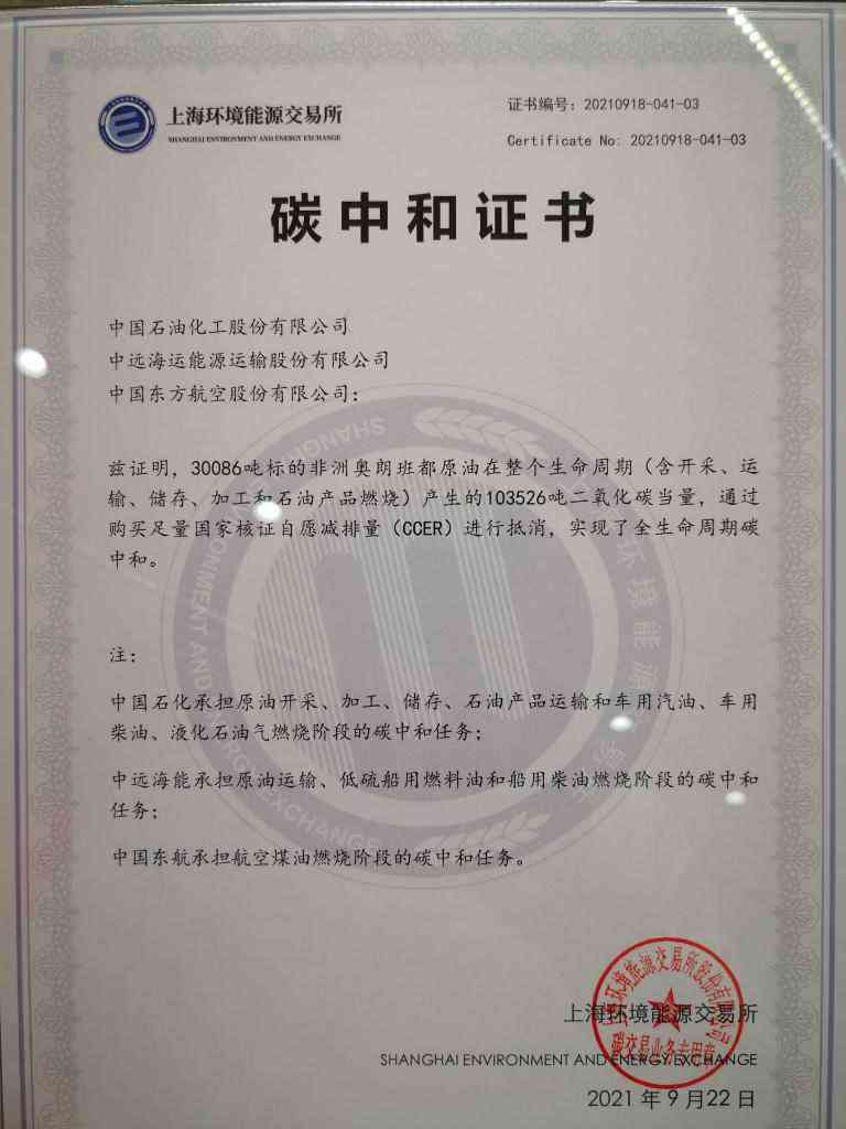 今年9月,一船原產(chǎn)自安哥拉的3萬(wàn)噸原油,行程9300余海里抵達(dá)舟山港。上海環(huán)境能源交易所為這船油頒發(fā)了我國(guó)首張?zhí)贾泻褪驼J(rèn)證書(shū)。中國(guó)石化、中遠(yuǎn)海運(yùn)、中國(guó)東航通過(guò)實(shí)施節(jié)能減排策略及購(gòu)買國(guó)家核證自愿減排量(CCER)來(lái)抵消石油全生命周期的碳排放。國(guó)內(nèi)石油業(yè)、航運(yùn)業(yè)和航空業(yè)的這次合作,實(shí)現(xiàn)了覆蓋海陸空全領(lǐng)域的石油碳中和,具有示范效應(yīng)。