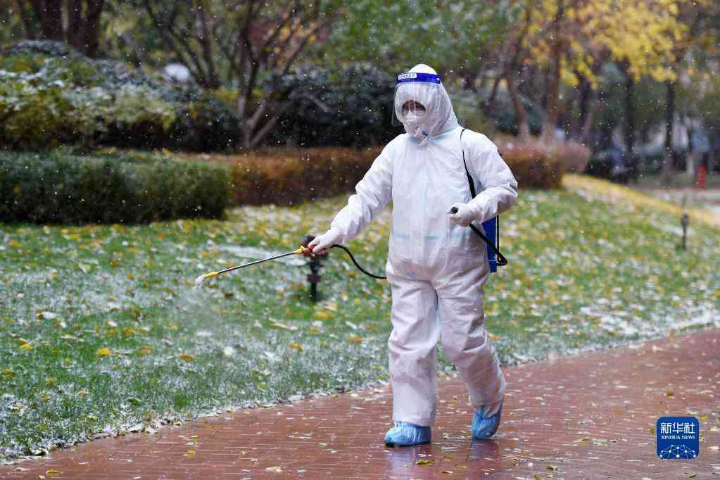 11月6日,在蘭州市七里河區(qū)仁恒美林郡小區(qū),工作人員在小區(qū)內(nèi)部進(jìn)行消殺作業(yè)。