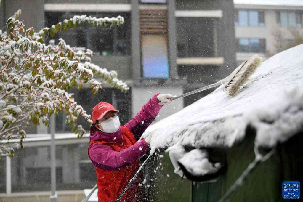 11月6日,工作人員在寧夏銀川市興慶區(qū)一小區(qū)內(nèi)一個封控單元前清理帳篷上的積雪。