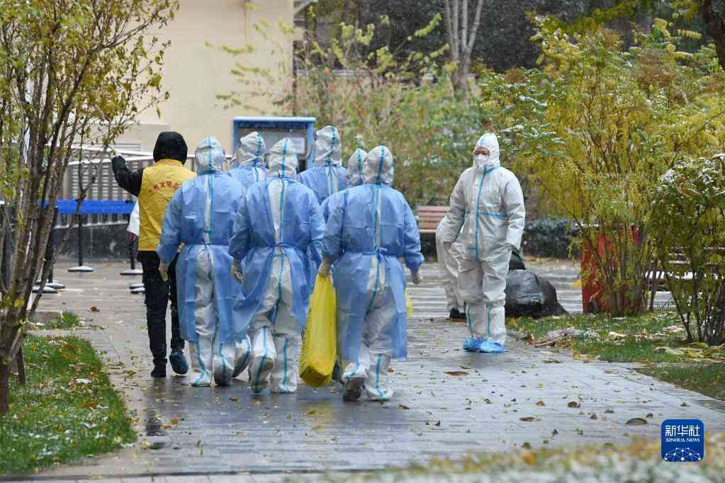 11月6日,在寧夏銀川市興慶區(qū)一處中風(fēng)險小區(qū)門前,前來支援的醫(yī)務(wù)人員在風(fēng)雪中等候分配任務(wù)。