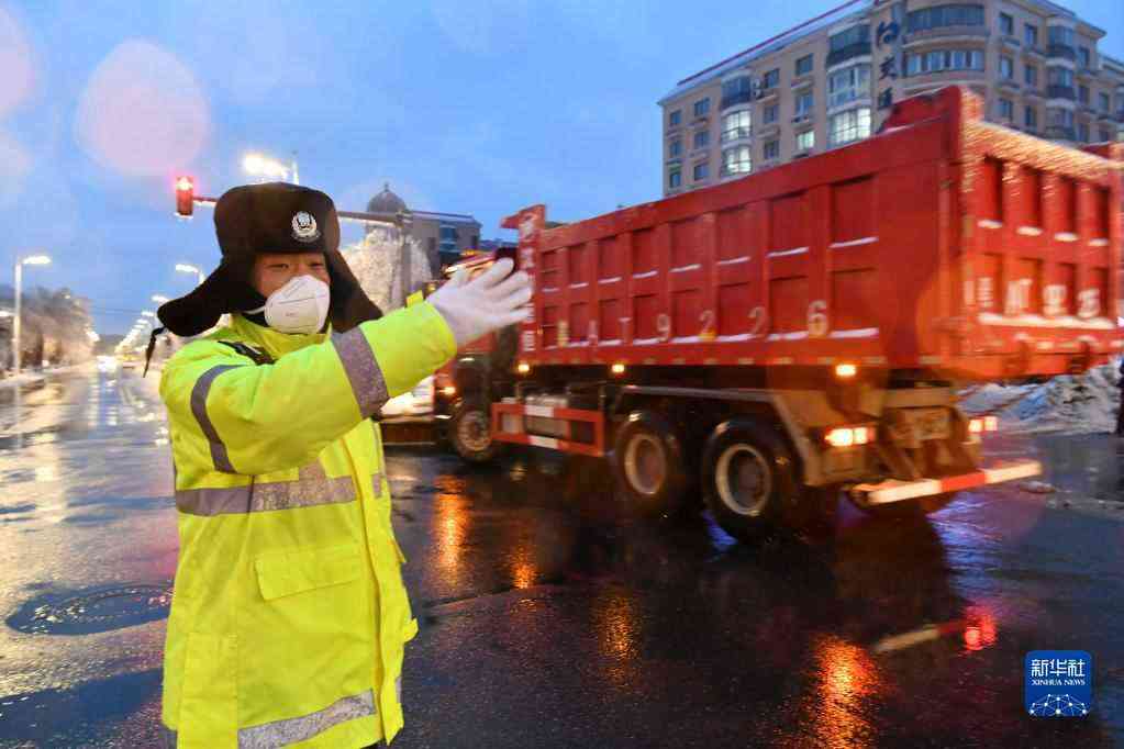 11月8日,在哈爾濱市平房區(qū),一名交通輔警在凍雨中指揮交通。