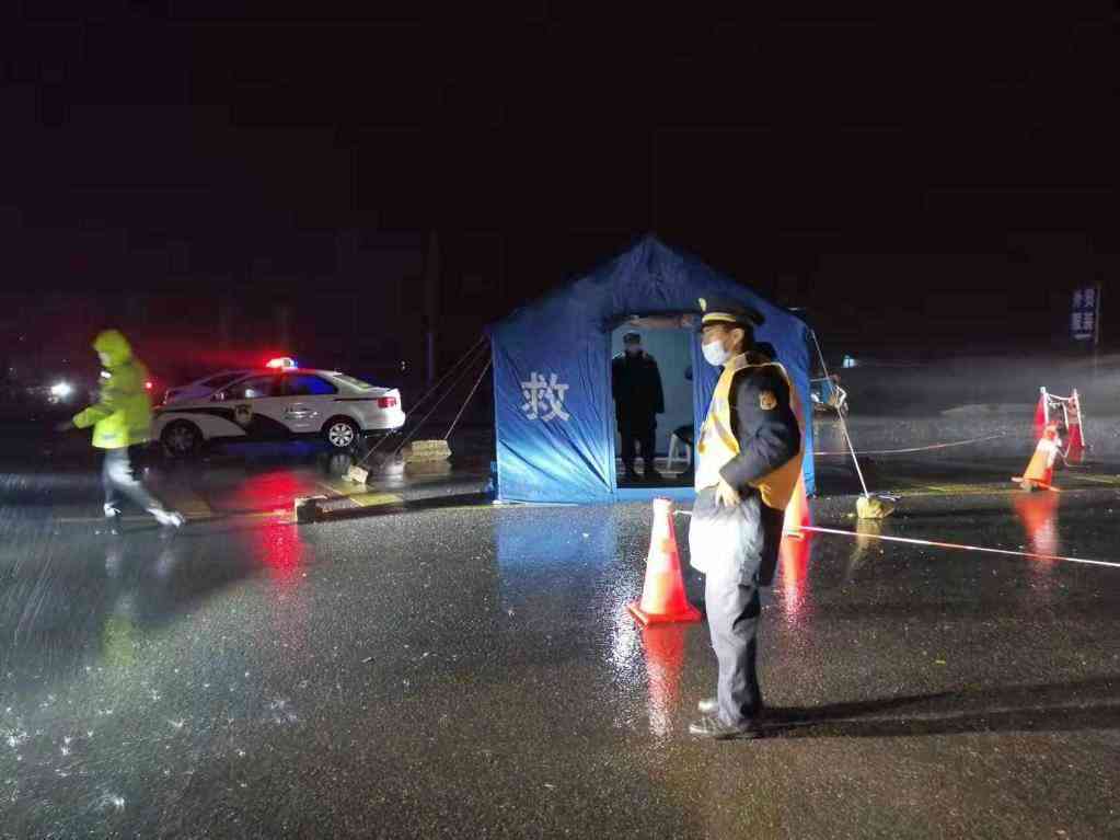 11月7日晚,公安、城管等隊伍在莊河市道路卡點(diǎn)冒雨值守。