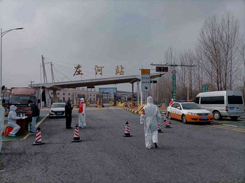 11月7日,身穿防護(hù)服的工作人員在高速公路莊河站出入口值守。