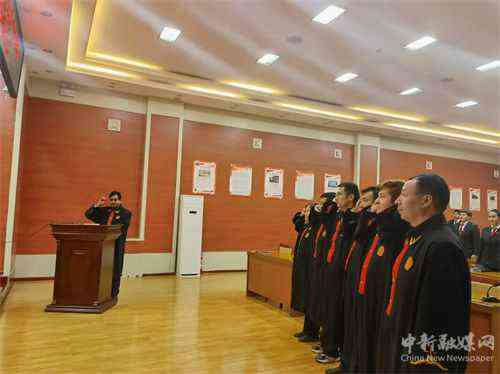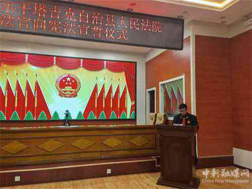 二樓會議室內(nèi),全體法官身著制服,胸佩法徽,精神抖擻,肅然站立。領(lǐng)誓人木拉提院長站在宣誓臺上,左手撫按《憲法》,右手舉拳。其他干警整齊排列,舉起右拳,莊嚴(yán)宣誓:“我宣誓,忠于中華人民共和國憲法,維護(hù)憲法權(quán)威,履行法定職責(zé),忠于祖國、忠于人民,恪盡職守、廉潔奉公,接受人民監(jiān)督,為建設(shè)富強(qiáng)、民主、文明、和諧的社會主義國家努力奮斗!”