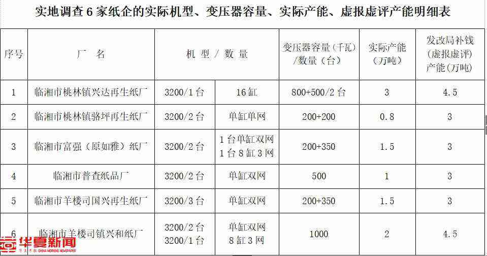 項(xiàng)新華經(jīng)過長(zhǎng)期的調(diào)查了解,基本上還原了臨湘市桃林鎮(zhèn)興達(dá)再生紙廠(現(xiàn)分錢產(chǎn)能4.5萬(wàn)噸)、臨湘市桃林鎮(zhèn)駱坪再生紙廠(現(xiàn)分錢產(chǎn)能3萬(wàn)噸)、臨湘市富強(qiáng)(原如雅)紙廠(現(xiàn)分錢產(chǎn)能3萬(wàn)噸)、臨湘市普查紙廠(現(xiàn)分錢產(chǎn)能3萬(wàn)噸)、臨湘市羊樓司國(guó)興再生紙廠(現(xiàn)分錢產(chǎn)能3萬(wàn)噸)、臨湘市羊樓司鎮(zhèn)興和紙廠(現(xiàn)分錢產(chǎn)能4.5萬(wàn)噸)6家企業(yè)的紙機(jī)型號(hào)、實(shí)際產(chǎn)能噸位、虛報(bào)虛評(píng)產(chǎn)能噸位、變壓器容量等數(shù)據(jù)(表格明細(xì)附后)。