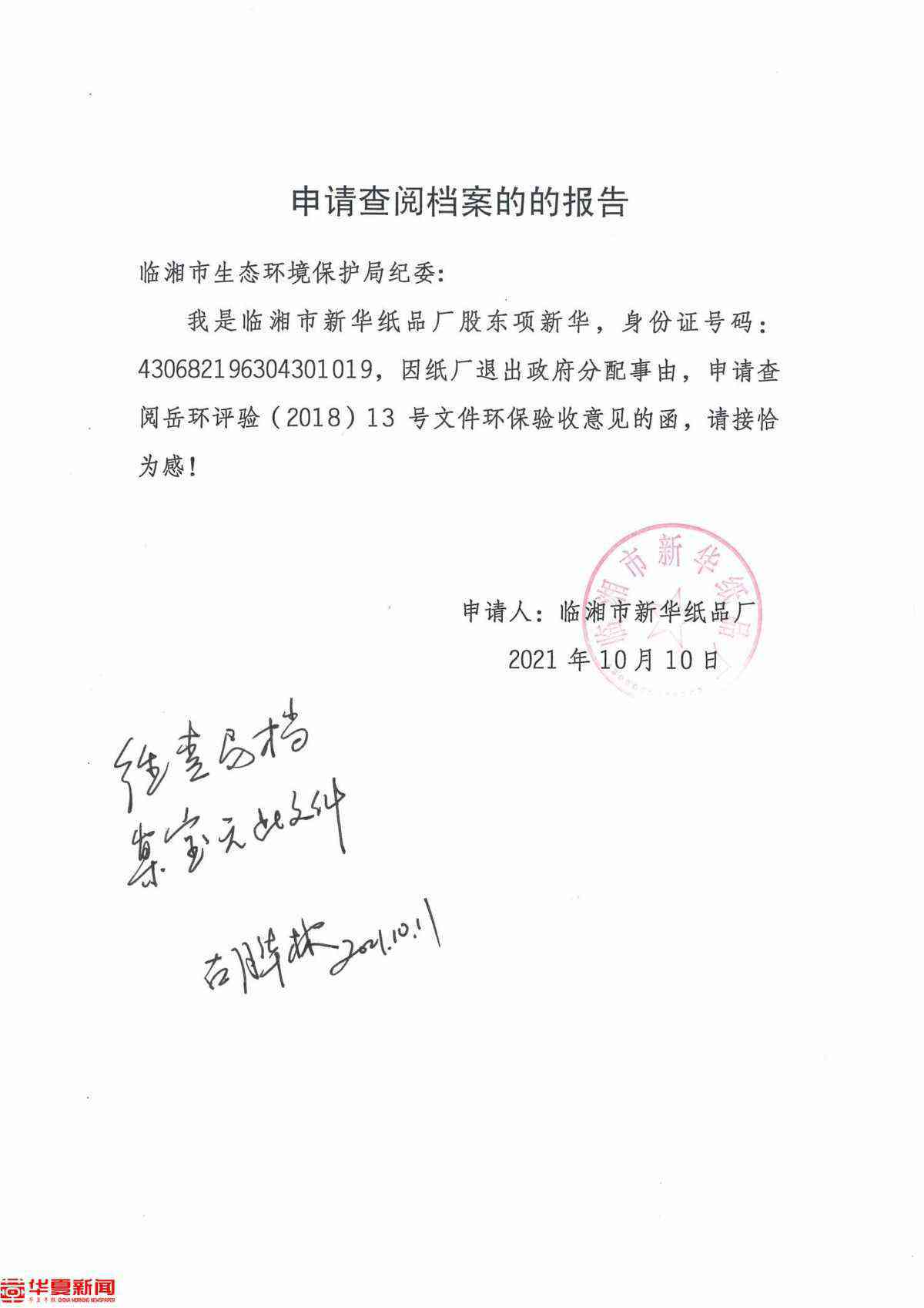 而更為詭異的事還在后頭。項(xiàng)新華與記者分別經(jīng)過明査暗訪核實(shí),在岳陽(yáng)市生態(tài)環(huán)境局并沒有查到這份文件,在岳陽(yáng)市政務(wù)大廳生態(tài)環(huán)境窗口,也沒有查到這份文件的檔案資料,項(xiàng)新華仍沒死心,又繼續(xù)到臨湘市生態(tài)環(huán)境局申請(qǐng)查閱該文件,后在該局紀(jì)檢組長(zhǎng)胡華林的大力協(xié)助下,也未能查到這份文件的檔案。以下附有胡組長(zhǎng)的證明。