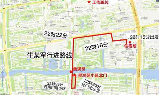 經警方反復試驗,牛某軍出現(xiàn)在各點位公共視頻的間隔時間與常人步行用時相符,且均未發(fā)現(xiàn)有人尾隨等可疑情況。