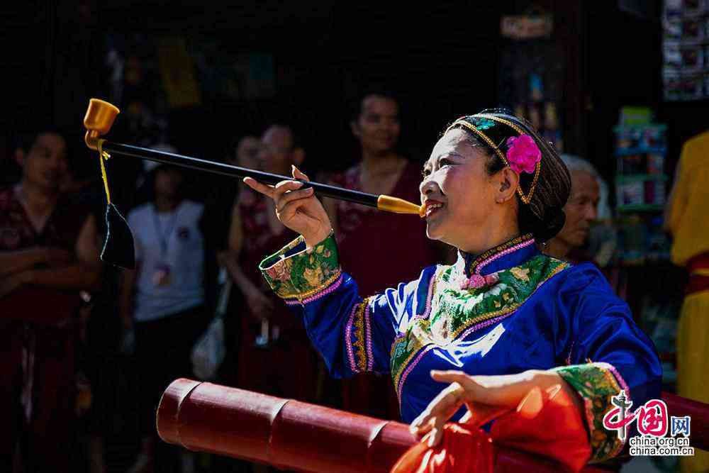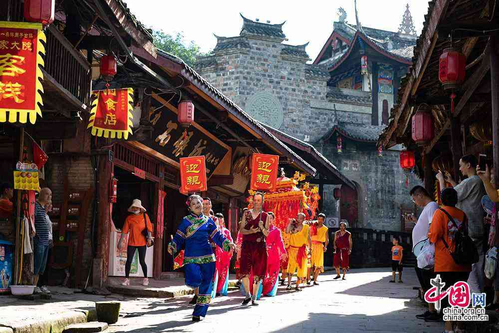 周子古鎮(zhèn)隸屬四川省南充市的蓬安縣,為中國(guó)“辭宗賦圣”司馬相如的故鄉(xiāng)。它一面緊臨嘉陵江,三面環(huán)依龍角山,像青龍一樣逶迤而上,歷經(jīng)兩千多年歲月滌蕩而風(fēng)采依然,成為嘉陵江上最后的古碼頭活化石。圖為古鎮(zhèn)上的民俗表演。中國(guó)網(wǎng)記者 董寧攝影