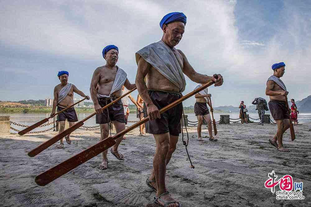 據(jù)介紹,周子古鎮(zhèn)下碼頭,在40年之前還是非常熱鬧的,當(dāng)時(shí)嘉陵江百船云集,船工號(hào)子響遏行云。圖為演員在表演劃船和拉纖,重現(xiàn)昔日情景。中國(guó)網(wǎng)記者 董寧攝影