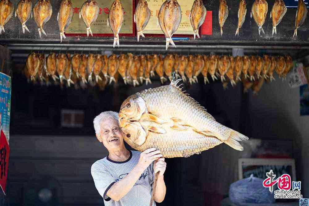 據(jù)記載,嘉陵江蓬安段有180多種魚類,野生的鯽魚、鯉魚、鰱魚、草魚、青膳、翹殼、青波等等,其中最著名的是嘉陵江蓬安段里的特產(chǎn)石梁沱江團(tuán)了。據(jù)悉,這種江團(tuán),下頜上有一點(diǎn)丹砂一般的紅印跡,此魚品嘗起來(lái)肉質(zhì)細(xì)嫩,味道鮮美,曾是歷朝歷代進(jìn)貢朝廷的貢品。圖為古鎮(zhèn)商戶展示嘉陵江內(nèi)捕獲的大魚晾制的干貨。中國(guó)網(wǎng)記者 董寧攝影
