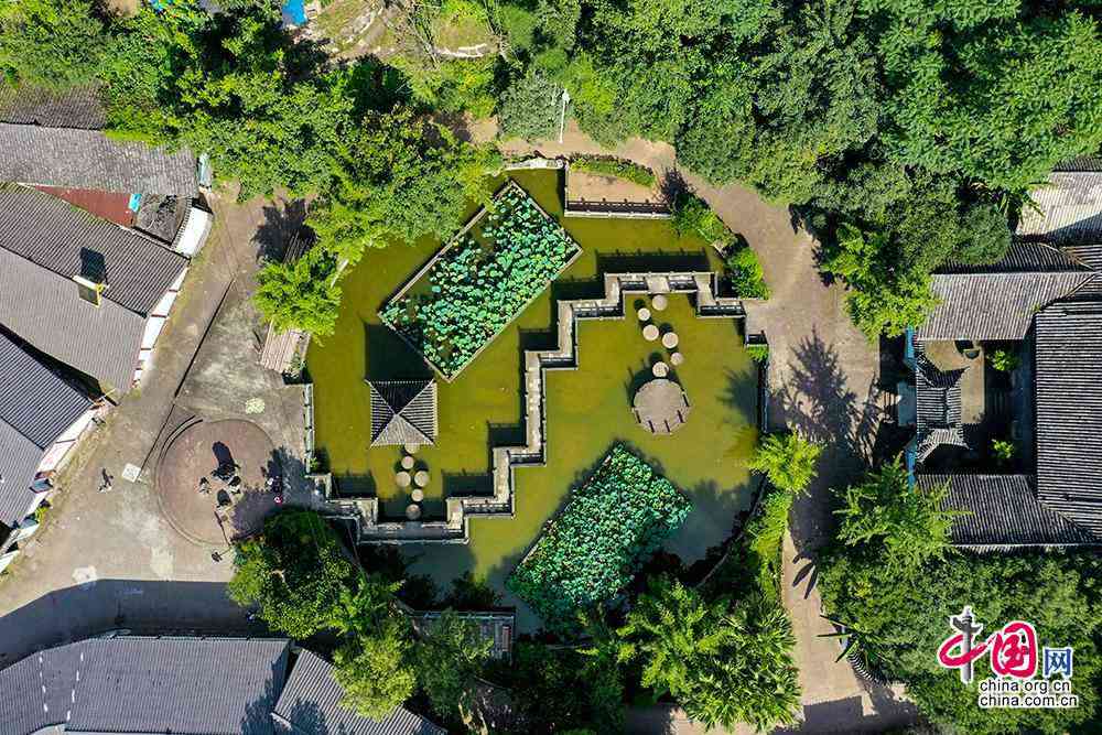 周子古鎮(zhèn)三面環(huán)山,一面環(huán)水,被譽(yù)為嘉陵江的碼頭古鎮(zhèn),其歷史已有1400多年。宋朝的理學(xué)鼻祖周敦頤因在此講學(xué),后人為紀(jì)念此事而建濂溪祠。濂溪祠位于古鎮(zhèn)下河鎮(zhèn)居委會(huì)后面,有戲臺(tái)、正殿,所建的愛蓮池雖面積不大,但池中青蓮?fù)ねび窳?。圖為鳥瞰愛蓮池。中國(guó)網(wǎng)記者  董寧攝影