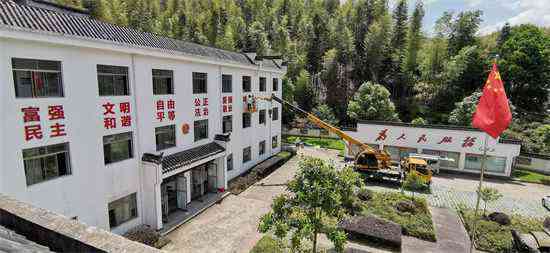 5月29日,筆者在休寧縣鶴城鄉(xiāng)人民政府辦公大樓看到,工人師傅們正利用吊車(chē)安裝“富強(qiáng)、民主、文明、和諧、自由、平等、公正、法治、愛(ài)國(guó)、敬業(yè)、誠(chéng)信、友善”24個(gè)醒目的紅色大字。