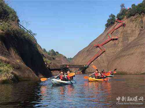皮劃艇劃行中,干部職工矯健的體形,有力的動作,讓漂亮的舟艇在丹霞水流中輕輕的劃過。加上人體所必需的陽光、空氣、水三大要素,無不給活動者以美的享受。