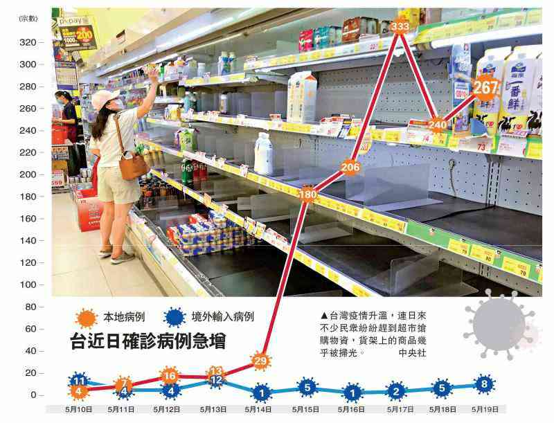 面對(duì)全臺(tái)新冠肺炎疫情多點(diǎn)爆發(fā),臺(tái)灣當(dāng)局“流行疫情指揮中心”19日宣布,新增本地新冠肺炎確診病例267例,全臺(tái)一律升至三級(jí)警戒,關(guān)閉大部分營(yíng)業(yè)及公共場(chǎng)所。由于島內(nèi)缺乏疫苗,臺(tái)灣疫情指揮中心稱(chēng),各縣市可以申請(qǐng)購(gòu)買(mǎi)大陸疫苗,由臺(tái)當(dāng)局統(tǒng)一處理。在臺(tái)灣的港人林女士向大公報(bào)表示,實(shí)施三級(jí)警戒后,超市的物貨很快被搶購(gòu)一空。她擔(dān)心當(dāng)局宣布“封城”后會(huì)買(mǎi)不到生活必用品。