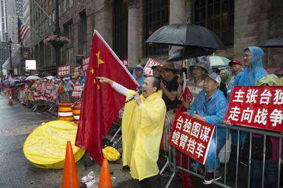 圖:二〇一九年七月,紐約華人華僑高呼反“臺獨”口號,抗議蔡英文“過境”美國。\資料圖片
