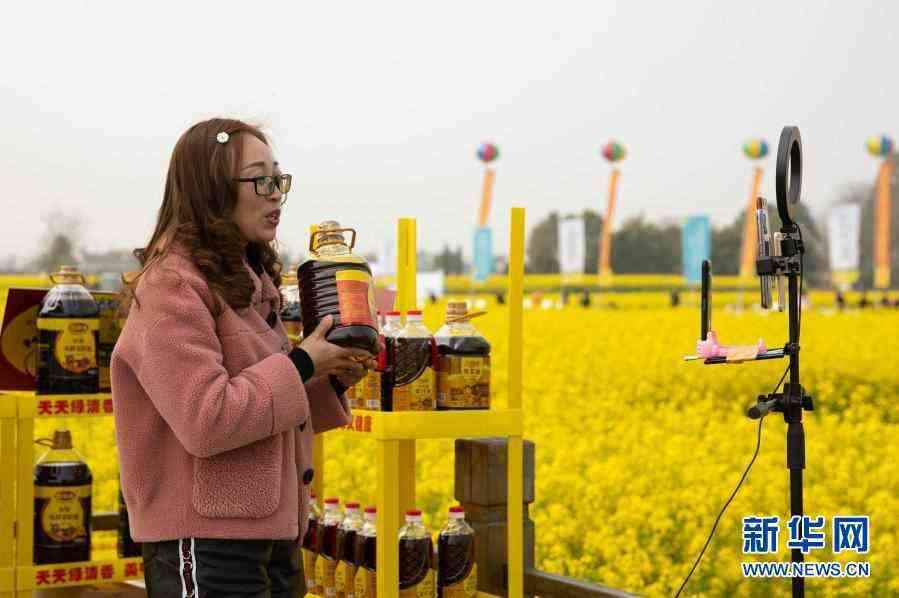 3月14日,在安州區(qū)秀水鎮(zhèn)龍泉村的油菜花海邊,一名企業(yè)員工在直播銷售菜籽油。