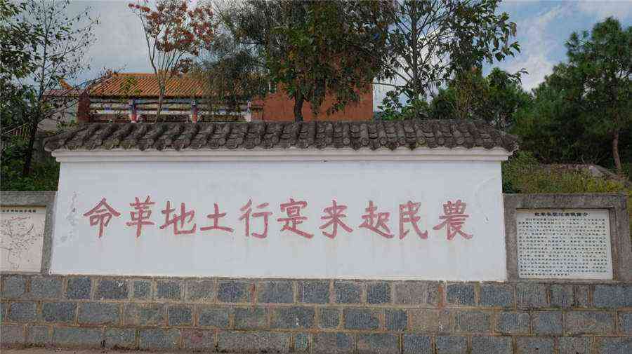 1935年4月30日,工農(nóng)紅軍第一方面軍兵分三路從嵩明向西挺進,其中一部紅軍經(jīng)東村、西村、竹箐口入尋甸到皎平渡口渡江。紅軍戰(zhàn)士在東村龍王廟廂房墻壁上寫下“農(nóng)民起來實行土地革命”的宣傳標語,喚醒了村民的革命意識。這條標語,成為嵩明縣東村社區(qū)寶貴的紅色文化資源。