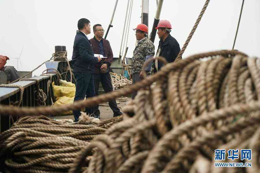 2020年10月21日,江蘇省海安市濱海新區(qū)紀工委干部(左一、左二)向漁船負責人詢問惠漁油補發(fā)放情況。 新華社記者 季春鵬 攝