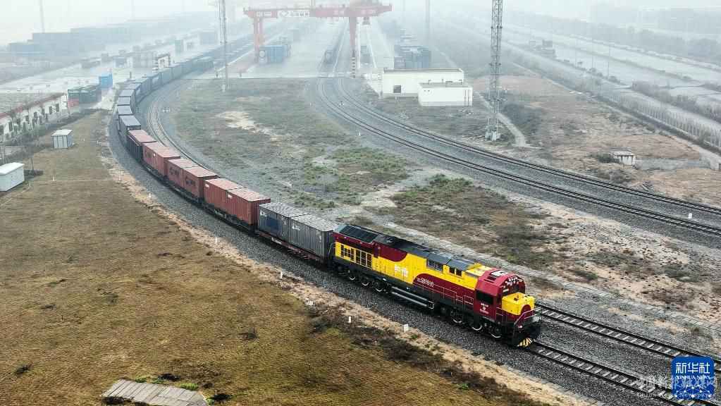 1月15日,廣西新年首趟西部陸海新通道年貨班列從欽州港東站駛出(無人機照片)。