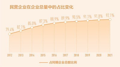 記者近日從國家市場監(jiān)督管理總局獲悉:2012—2021年,我國民營企業(yè)數(shù)量從1085.7萬戶增長到4457.5萬戶,10年間翻了兩番,民營企業(yè)在企業(yè)總量中的占比由79.4%提高到92.1%,在穩(wěn)定增長、促進(jìn)創(chuàng)新、增加就業(yè)、改善民生等方面發(fā)揮了重要作用,成為推動經(jīng)濟(jì)社會發(fā)展的重要力量。