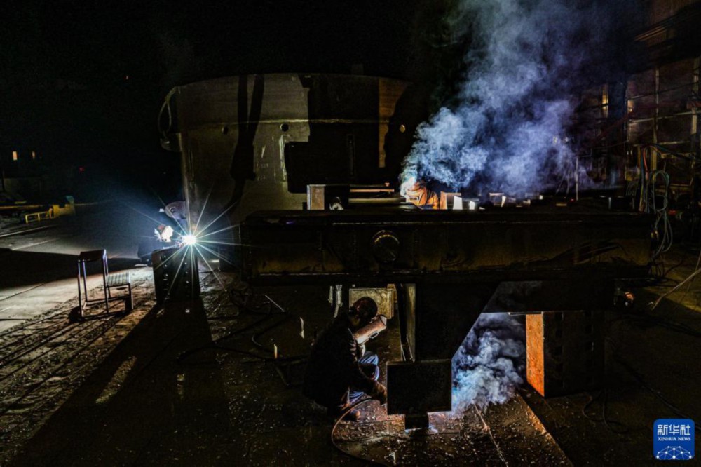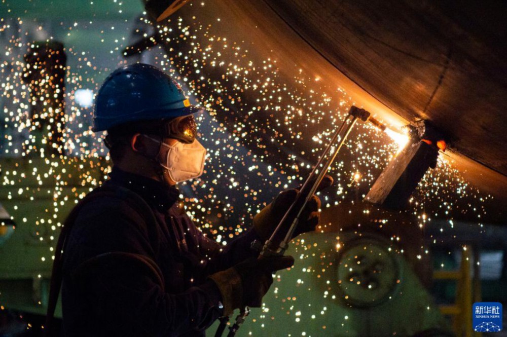 3月24日,在位于遼寧省沈陽(yáng)市鐵西區(qū)的方大集團(tuán)沈陽(yáng)北方重工有限公司,工人在車(chē)間焊接產(chǎn)品。