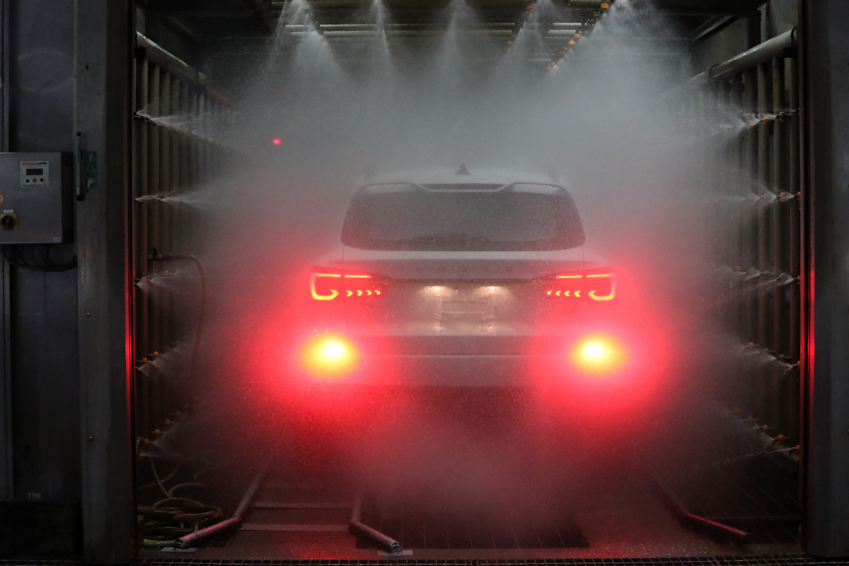 4月23日,在上汽臨港總裝車間,一輛轎車在進(jìn)行清洗。 中國(guó)日?qǐng)?bào)記者 朱興鑫 攝