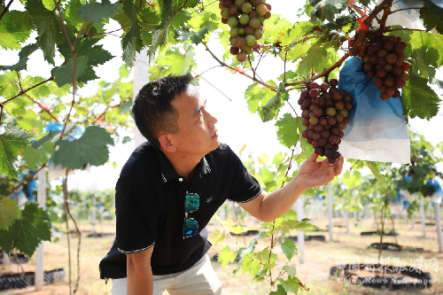 皇田村黨總支書(shū)記王偉在察看葡萄生長(zhǎng)情況。