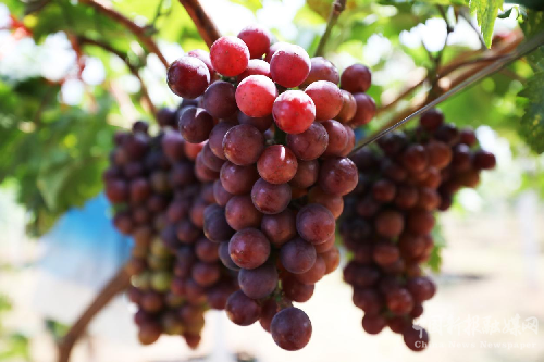 記者在三拓農(nóng)業(yè)產(chǎn)業(yè)園葡萄基地里看到,一條條藤蔓上掛滿了玲瓏剔透的葡萄,在陽(yáng)光的照射下宛如一顆顆會(huì)發(fā)光的珠子。濃郁的果香撲鼻而來(lái),葡萄架下,果農(nóng)們正忙著將成熟的葡萄采摘裝筐。種植管理員莫從格正在采收一串串成熟的“皇田”葡萄,“今年首次掛果,預(yù)計(jì)畝產(chǎn)葡萄1000斤以上,這批葡萄以每斤20元的價(jià)格出售。”莫從格滲著汗珠的臉上,露出豐收的喜悅。他告訴記者,“金香一號(hào)”是繼“陽(yáng)光玫瑰”后的又一個(gè)有發(fā)展前途的好品種。這種葡萄果粒碩大,果肉細(xì)致緊實(shí),含糖量高。而“紅玫瑰”外觀呈現(xiàn)紫紅色,顆粒比較重,看上去像是一串串紅色的寶石一樣,吃起來(lái)味道香甜,感覺(jué)有一絲絲的玫瑰香味。