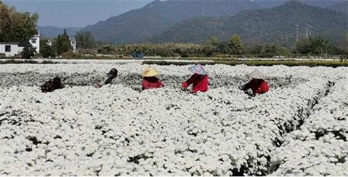 “我家去年菊花毛收入25萬元,付出采菊工資就有4萬多元。”10月19日,休寧縣鹽鋪菊花花開如銀,村民胡東升欣喜地介紹,“今年我家種植了16畝菊花,有白菊、黃菊、金絲黃菊等多個品種。”