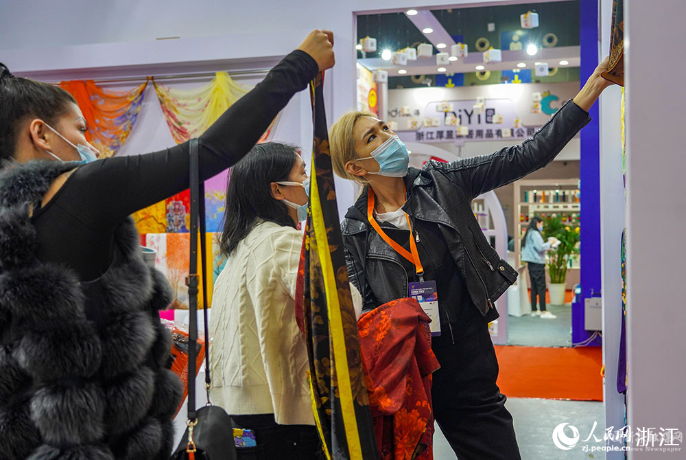 11月24日,來(lái)自俄羅斯的客商Aku(右一)在義烏國(guó)際博覽中心采購(gòu)圍巾。人民網(wǎng) 章勇濤攝