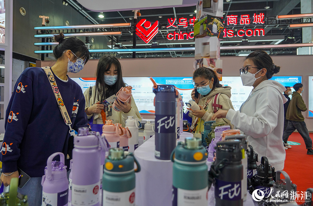 11月24日,客商在義烏國(guó)際博覽中心了解保溫杯。人民網(wǎng) 章勇濤攝