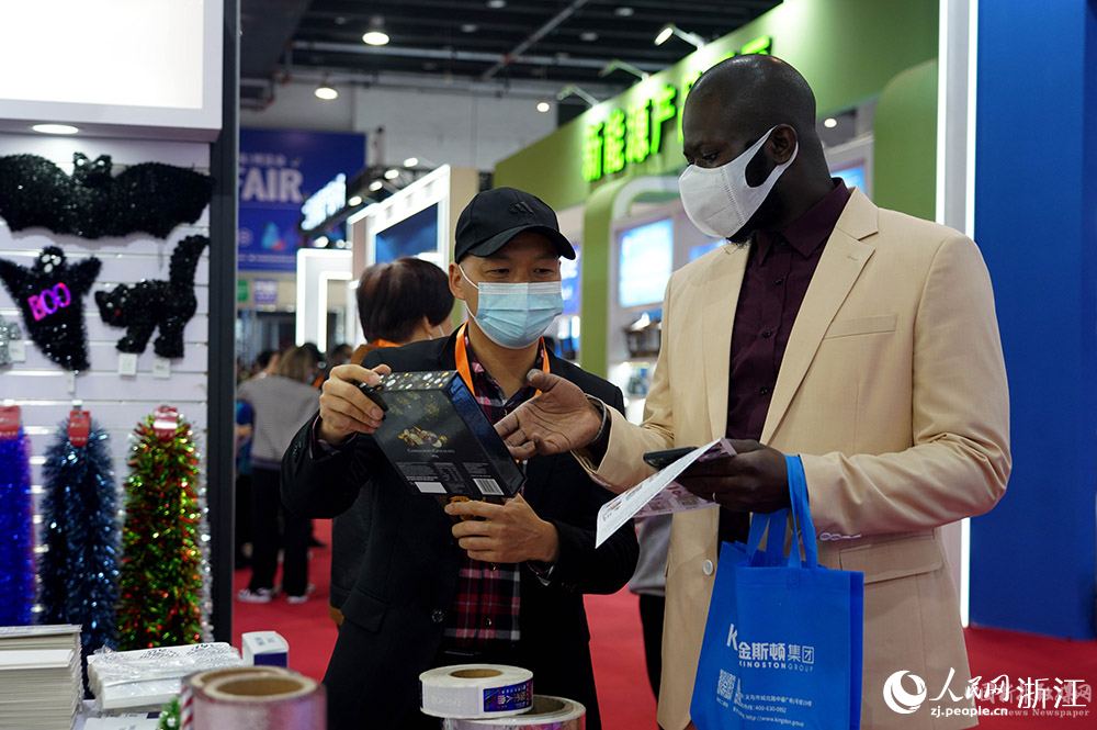 11月24日,來(lái)自塞內(nèi)加爾的客商吉他(右一)在義烏國(guó)際博覽中心了解商品。人民網(wǎng) 章勇濤攝