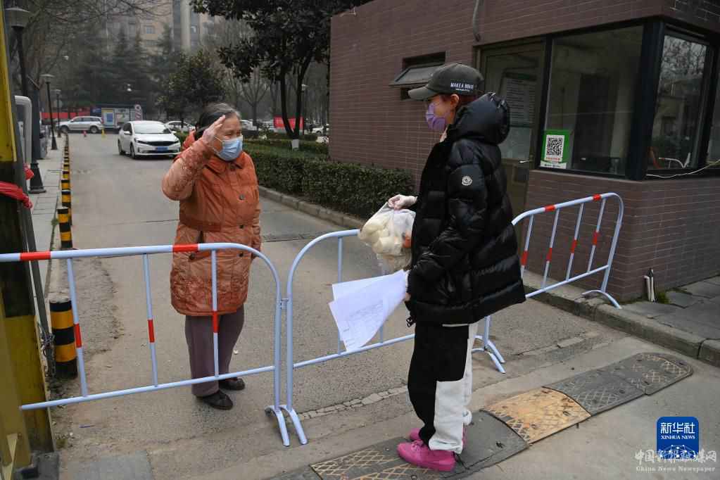 1月5日,西安市北辰大道一社區(qū)82歲的金禮芳老人(左)收到志愿者送來的生活物資。