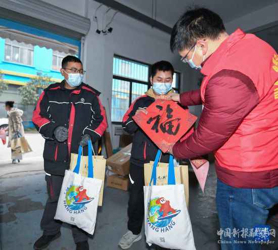 1月5日,在塘棲鎮(zhèn)景河路的快遞驛站,塘棲古鎮(zhèn)黨建聯(lián)盟的黨員志愿者給快遞小哥送上新春大禮包。