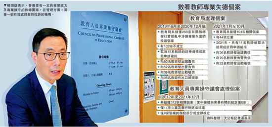 楊潤雄說,以往的教師投訴通常有兩個渠道,一是通過教育人員專業(yè)操守議會,二是直接交由教育局處理。教育局方面,自2019年6月至2020年12月底,共接獲269宗關(guān)于教師在社會動亂中涉嫌專業(yè)失德的投訴。除了涉及司法程序等特殊情況,教育局已完成所有個案,其中102宗不成立。在成立的個案中,局方已按《教育條例》取消4名教師的注冊資格,向50名教師發(fā)出譴責信、向52名教師發(fā)出書面警告。教育局亦分別向38名教師發(fā)出書面勸喻,以及向36名教師作出口頭提示,提醒他們不應(yīng)作出有損教師專業(yè)形象的行為和應(yīng)尊重社會接受的行為準則。同時,有七宗個案涉及司法程序,當局會在有關(guān)程序完結(jié)后,按《教育條例》采取行動。
