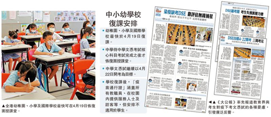 行政長(zhǎng)官林鄭月娥昨日在記者會(huì)上宣布,全港幼稚園、小學(xué)及國(guó)際學(xué)校最快可在4月19日恢復(fù)面授課堂,率先復(fù)課。中學(xué)則待中學(xué)文憑考試(DSE)核心科目考試完成之后,才恢復(fù)面授課堂,目前維持以4月22日開考DSE為目標(biāo)。