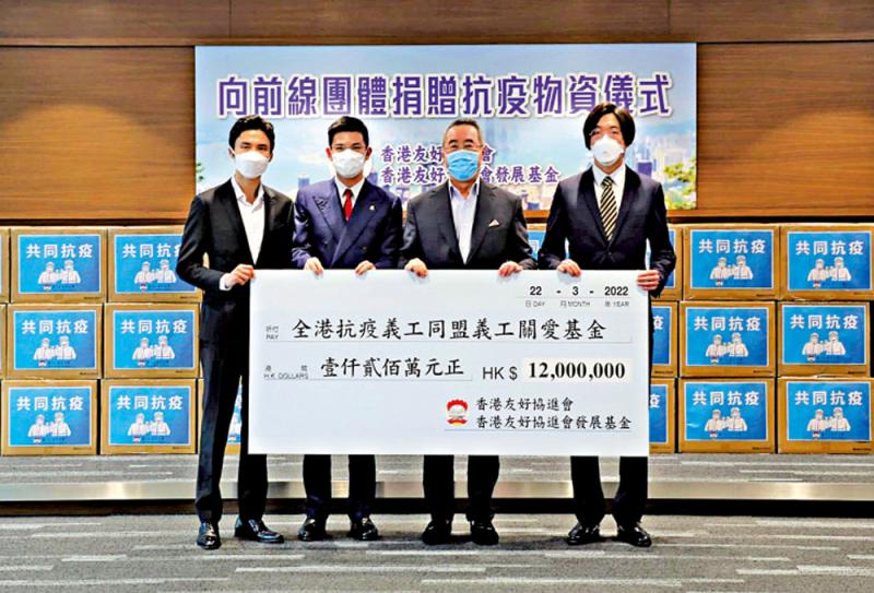 為表達(dá)對這些逆行義工人員的敬意和支持,香港友好協(xié)進(jìn)會昨日舉行捐贈支票儀式,向“全港抗疫義工同盟義工關(guān)愛基金”捐款1200萬元。同日,香港友好協(xié)進(jìn)會再向民建聯(lián)義工捐贈KF94口罩20000個(gè)。