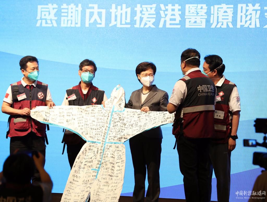 5月5日,內(nèi)地援港醫(yī)療隊(duì)向香港特區(qū)行政長官林鄭月娥(左三)贈送簽名防護(hù)衣。新華社記者 李鋼 攝