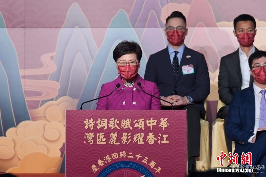 6月15日,香港島婦女聯(lián)會為慶祝香港回歸25周年,在香港會議展覽中心舉辦“中華傳統(tǒng)文化展演——詩詞歌賦頌中華 灣區(qū)麗影耀香江”。圖為香港特區(qū)行政長官林鄭月娥致辭。 中新社記者 陳永諾 攝