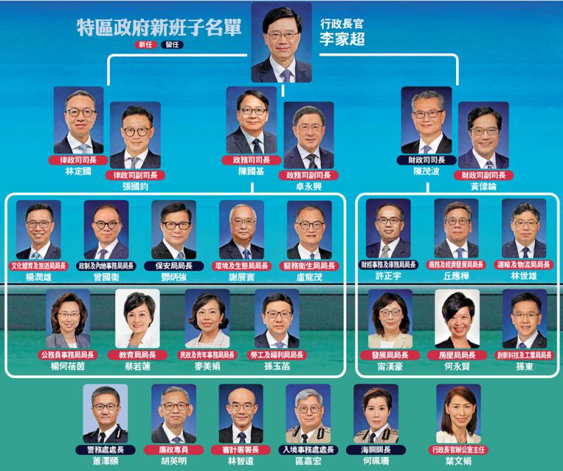 李家超昨日率新班子在政府總部演講廳召開記者會。他表示,新加入特區(qū)政府的人員約占三成,他們分別在其領(lǐng)域有豐富專業(yè)知識、經(jīng)驗和地位,或有相關(guān)聯(lián)系網(wǎng)絡(luò),有認受性和執(zhí)行能力。新班子的26人中,女性有6位,約占四分之一,是歷屆特區(qū)政府最高。